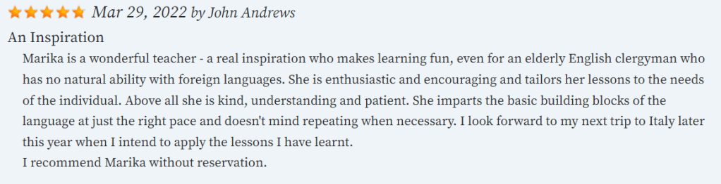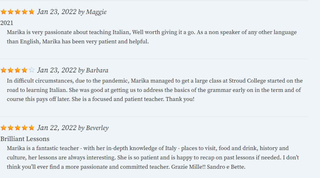 Marika is a great teacher, really enthusiatic, helpful and someone who definitely goes the extra mile to keep you motivated… Grazie mille, Marika, ho imparato un sacco di cose! Ti ringrazio molto, buona vacanze, Michele