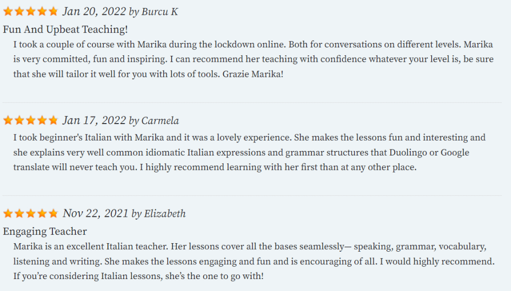Marika is an excellent teacher who makes her lessons very varied and interesting. Marika uses games, videos and music. We also learn about Italian customs and different places. The lessons are fun too!